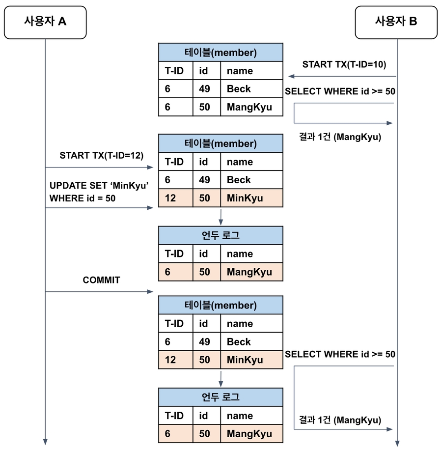 사용자B가 다시 동일한 SELECT문 실행UNDO로그(조회 결과): MangKyu