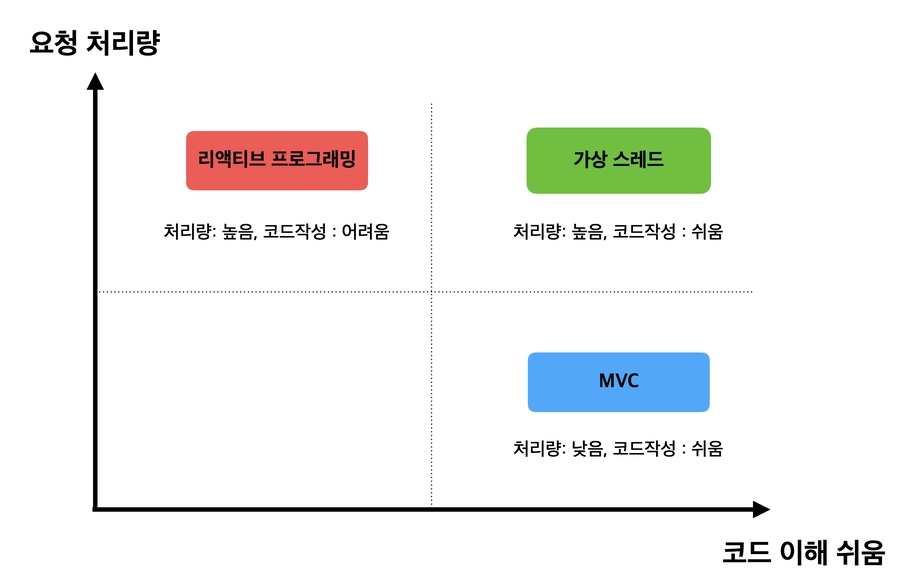 - 가상 스레드를 사용하면 Non-blocking에 대한 처리를 JVM 레벨에서 담당함 - 따라서 Spring Web MVC 스타일로 코드를 작성하더라도 내부에서 가상 스레드가 기존의 플랫폼 스레드를 직접 사용하는 방식보다 효율적으로 스케줄링하여 처리량을 높일 수 있음