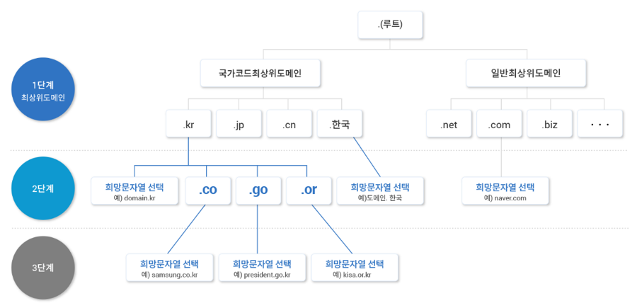 3단계 도메인: 조직이나 서비스의 이름을 나타내는 도메인 이름으로, 사용자가 원하는 문자열을 사용할 수 있음
