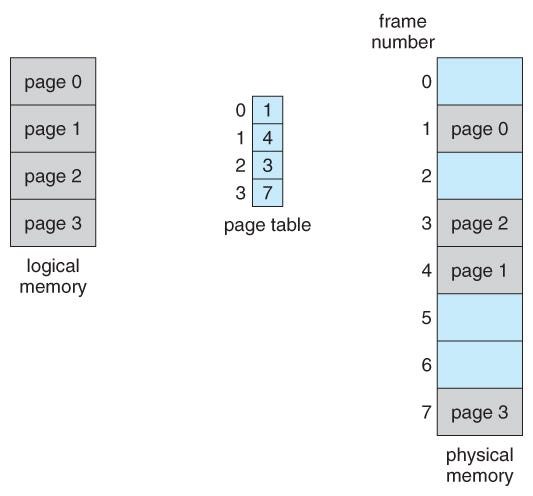 논리 메모리는 물리 메모리에 저장될 때, 연속되어 저장될 필요가 없고 물리 메모리의 남는 프레임에 적절히 배치됨