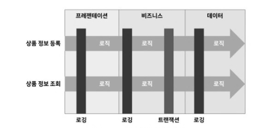 - 공통 관심사(cross-cutting concern): 각각의 모듈들의 주 목적 외에 필요한 부가적인 기능들(로깅, 동기화, 오류 검사 등)로, 공통적으로 사용되는 기능