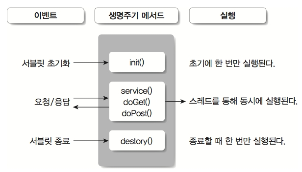 - 서블릿 생명주기 관리 - 서블릿 컨테이너는 서블릿 클래스 로딩하여 인스턴스화하고 init() 메소드를 호출, 적절한 서블릿 메소드 등을 호출하게 도와준다.